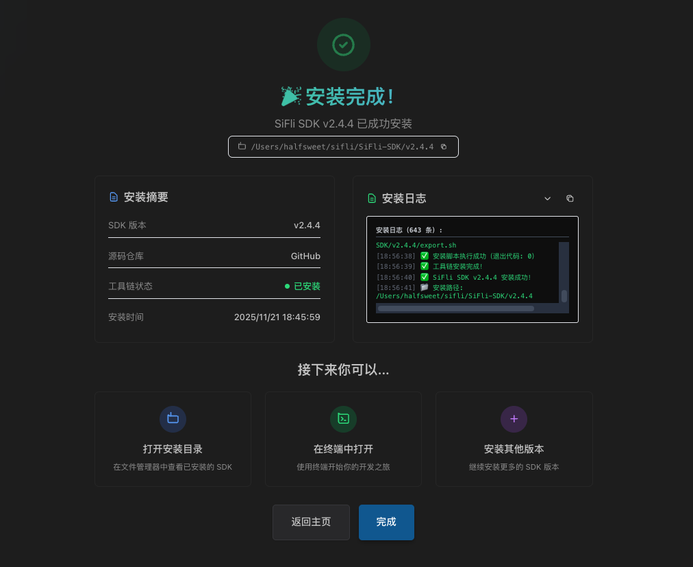 点击完成按钮,安装过程即告结束。你现在可以开始使用 SiFli-SDK-CodeKit 进行项目开发了!