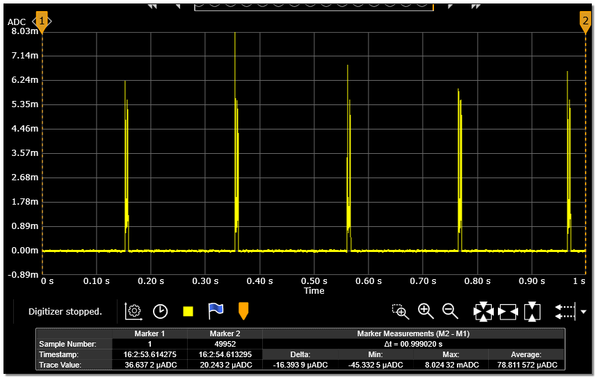 重复步骤 5 和 6,测量 ADV 间隔为 1000ms 的电流。