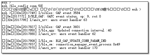 将唤醒 PIN 接低电平,系统退出低功耗模式,在 console 里发送命令ble_config conn 50,将连接周期改为 50ms,确认 console 出现如下图打印,其中Updated connection interval:40表示 1.25ms 单位的连接间隔,40×1.25=50ms,如果未出现打印,则表示参数更新失败,需要再次发送命令,同时观察电流波形确认间隔是否更新成功