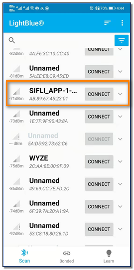 在手机上打开如下图的 LightBlue 软件,在 Scan 列表找到名为 SIFLI_APP 的设备,点击 CONNECT 连接设备