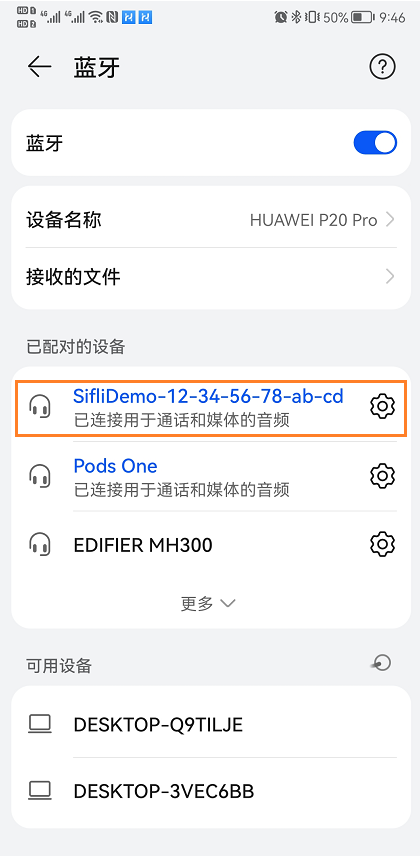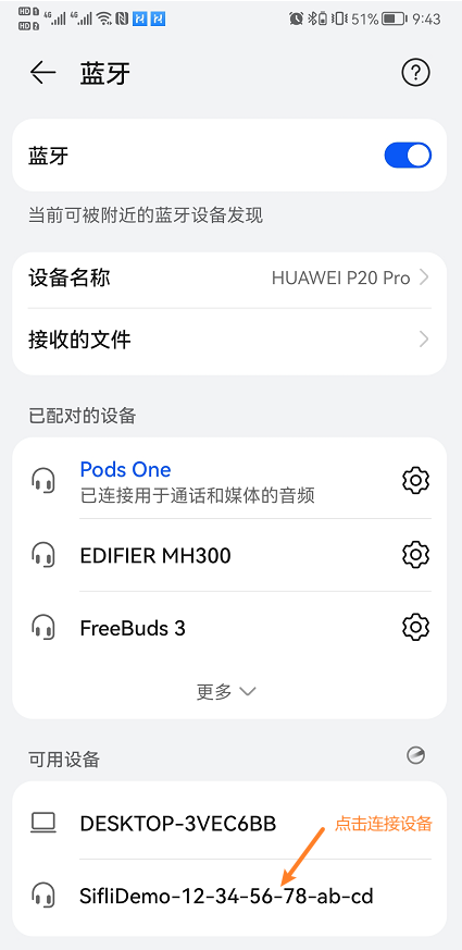 手机连接开发板对应的蓝牙设备,点击后弹出配对窗口,点确认后配对成功,蓝牙设备进入已配对设备列表,并显示已连接状态,如下图: