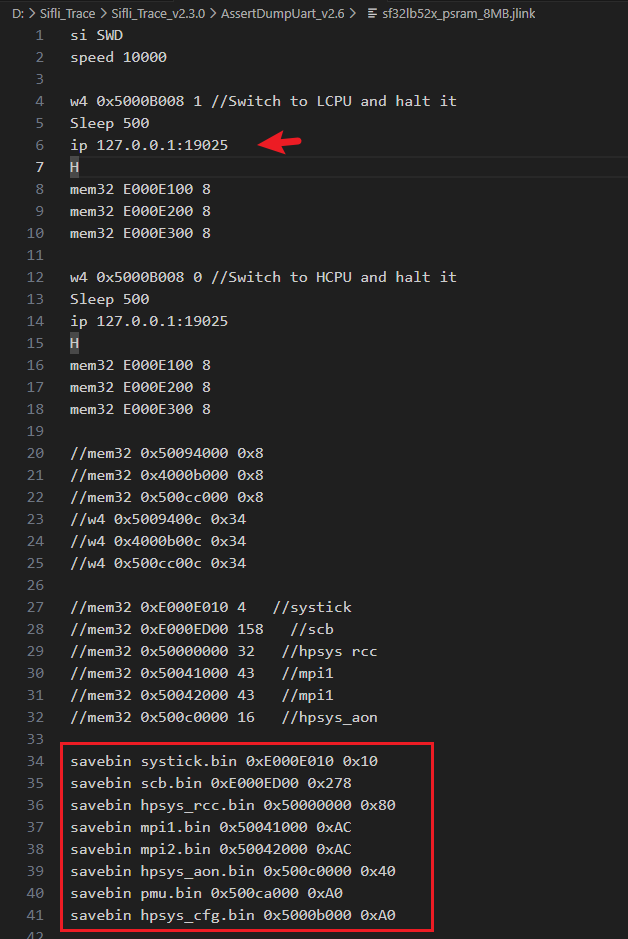 使用UART硬件连接方式或使用Jlink硬件连接方式保存现场都是通过调用JLink.exe然后执行相应的Jlink命令来达到效果,可以查看 save_ram_xxx.bat 以及被调用的 sf32lbxxx.jlink 文件内容对比,ip则表示使用ip服务模拟Jlink方式保存现场(对应串口方式),usb则表示使用usb连接JLink仿真器方式保存现场(对应jlink-swd方式),在保存现场之前可以先确认执行过程调用的Jlink文件,以及Jlink命令,防止命令与实际保存现场方式不匹配导致保存现场失败