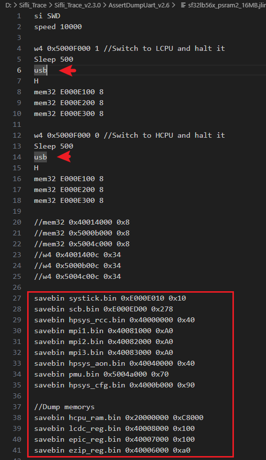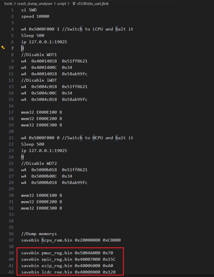 在大多数例程当中小核并未被启动,例如sf32lb55x.jlink中有w4 0x4004f000 1 //Switch to LCPU命令但是程序并未启动小核则保存现场会失败,我们需要将对小核发起的命令进行注释以保证脚本正常运行