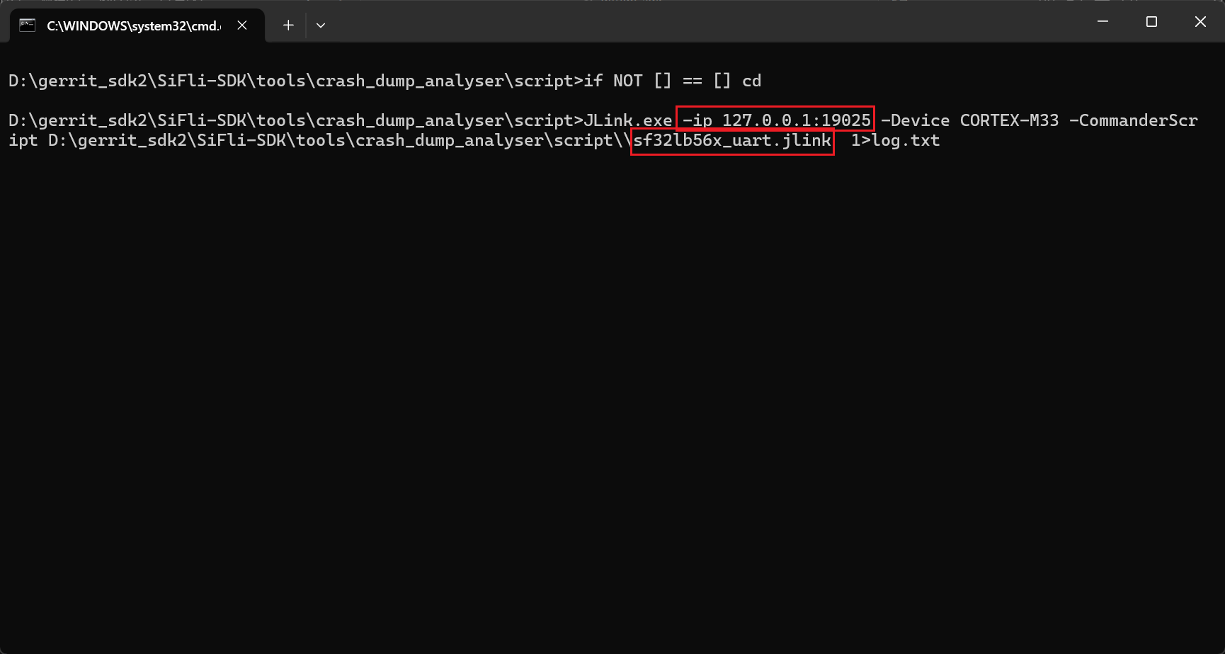 深层逻辑:当我们执行 save_ram_uart_56x.bat 之后发送了使用Jlink.exe调用 sf32lb56x_uart.jlink 的命令,并将日志输出在script/log.txt中,具体命令如下: