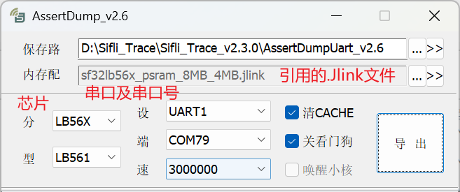 软件通过ip服务调用Jlink文件执行导出命令,其中串口选择:HCPU核心选择UART1,LCPU核心选择UART4,.Jlink文件选择需要根据芯片psram大小选择,否则导出psram.bin文件会失败