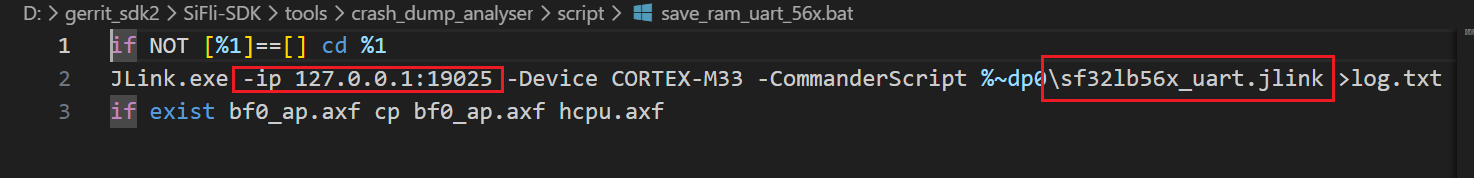 深层逻辑:当我们执行 _save_ram_56x.bat 调用了 sf32lb56x.jlink 的命令,并将日志输出在script/log.txt中,具体命令如下: