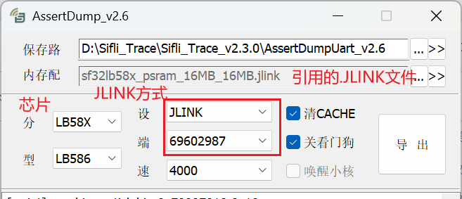 软件通过检测是否有已连接的Jlink仿真器,调用Jlink文件执行导出命令,其中软件需要选择JLINK方式以及确保有检测到Jlink仿真器(号码),.Jlink文件选择需要根据芯片psram大小选择,否则导出psram.bin文件会失败