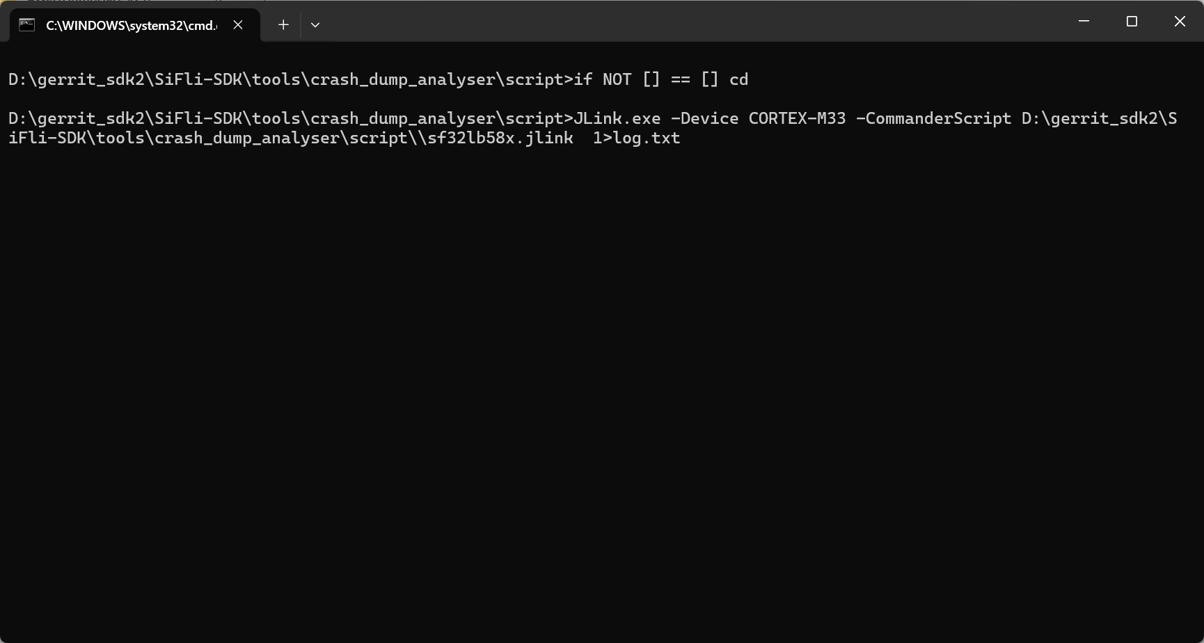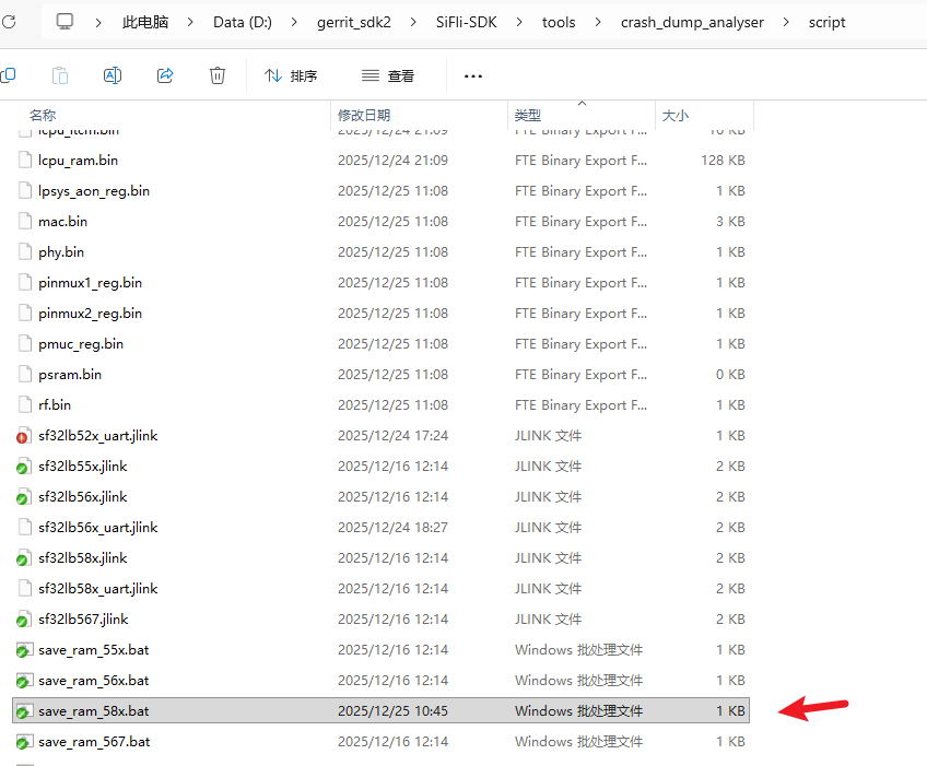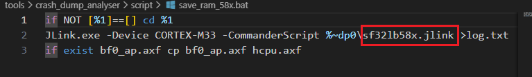 深层逻辑:当我们执行 _save_ram_58x.bat 调用了 sf32lb58x.jlink 的命令,并将日志输出在script/log.txt中,具体命令如下: