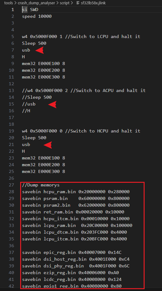 在大多数例程当中小核并未被启动,例如sf32lb55x.jlink中有w4 0x4004f000 1 //Switch to LCPU命令但是程序并未启动小核则保存现场会失败,我们需要将对小核发起的命令进行注释以保证脚本正常运行