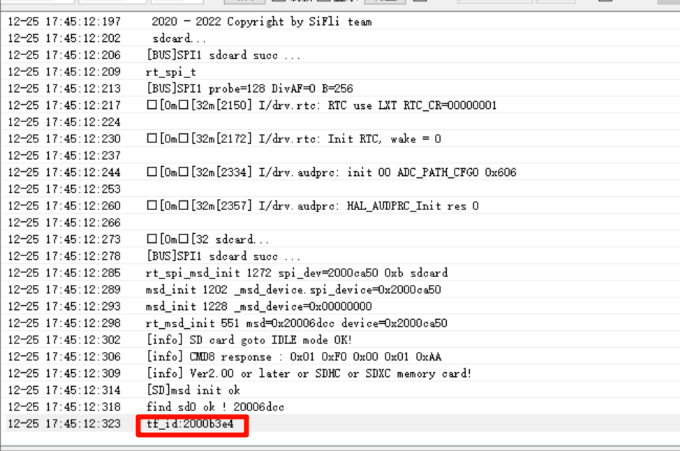 通过rt_msd_init()函数进行设备的转换和spi参数的额配置,并且发送一系列的CMD指令初始化TF卡和读取其cid寄存器中的数据,即可得到其id了