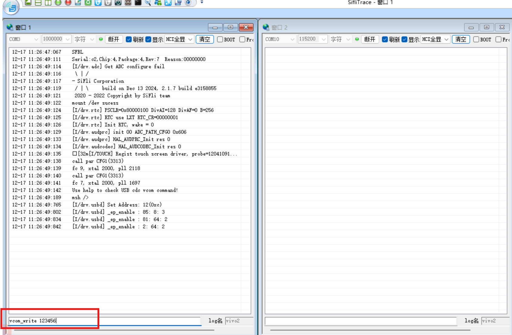 1、串口数据发送;输入finsh指令”vcom_write 123456”(使用串口工具SifliTrace)