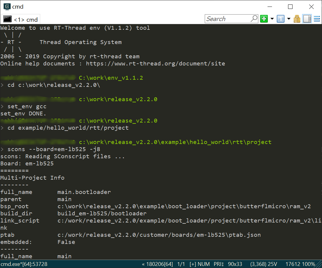 点击ConEmu Here菜单启动Env命令行窗口,命令行所在的目录为点击右键菜单所在的目录,显示下图窗口即表示Env命令行已正常打开,后续的应用配置、编译和烧写都将在该命令行窗口下完成。