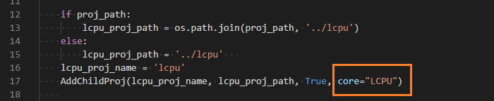 由于子工程可能运行在不同的核上,需要在SConstruct脚本添加子工程的时候增加参数指定子工程运行在哪个核上,不指定则与主工程相同,例如下图添加了LCPU子工程
