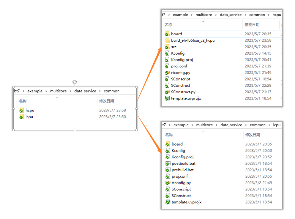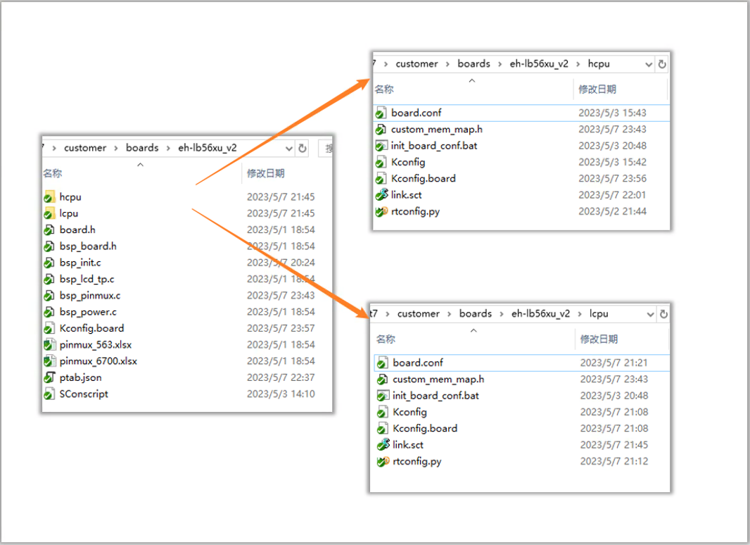 有时同一个型号的HDK会贴不同的芯片,为了避免在不同的板子目录下放置相同的IO设置代码,可以将公共代码放到一个目录, 再由不同板子来引用,如下图所示,公共代码放在了eh-lb56xu_v2,开发板HDK561对应文件夹eh-lb561_v2,开发板HDK563对应文件夹eh-lb563_v2, 他们的一级目录可以简化,引用eh-lb56xu_v2下的文件,HCPU和LCPU的仍旧放在这两个开发板目录下。