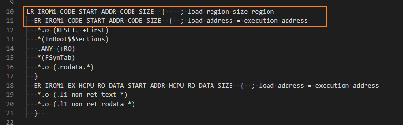多工程编译时,同样运行于HCPU的主工程和子工程可能都会使用同一个板子目录下的链接脚本,但他们的代码编译地址又不一样, 比如下图是 link.sct 的代码段部分,起始地址都是CODE_START_ADDR,大小为CODE_SIZE,但在编译主程序和二级bootloader时, 这两个宏的取值是不同的。