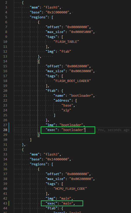 为此,ptab.h的生成脚本增加了一个功能,在 ptab.json 中使用属性”exec”定义该region是哪个工程的代码执行段, 属性值为工程名,主工程是“main”,子工程与AddChildProj时指定的名称一致。例如下面的 ptab.json 中, 二级bootloader的代码段以FLASH_BOOT_LOADER命名,主工程的以HCPU_FLASH_CODE命名。