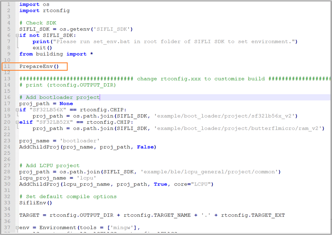 区别于以前的工程,需要在SConstruct脚本的开始调用PrepareEnv(), 准备板子的编译环境,如下图