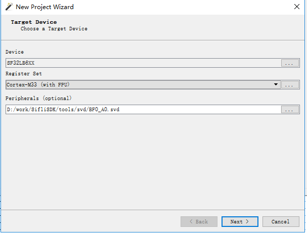 新建一个工程,选择适当的Device驱动(ButterFlier 是SF32LB6XX), CPU型号(ButterFlier 是CM33), 以及外设SVD文件(用于看外设寄存器内容,仅供Sifli内部使用,用户可以忽略,设为空)