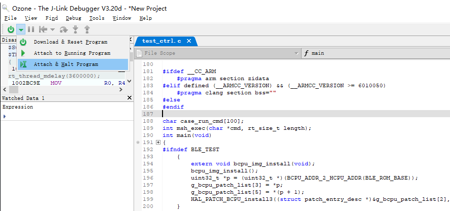 工程建立完毕,然后将Ozone 通过Jlink Attach到死机的板子并且Halt住板子