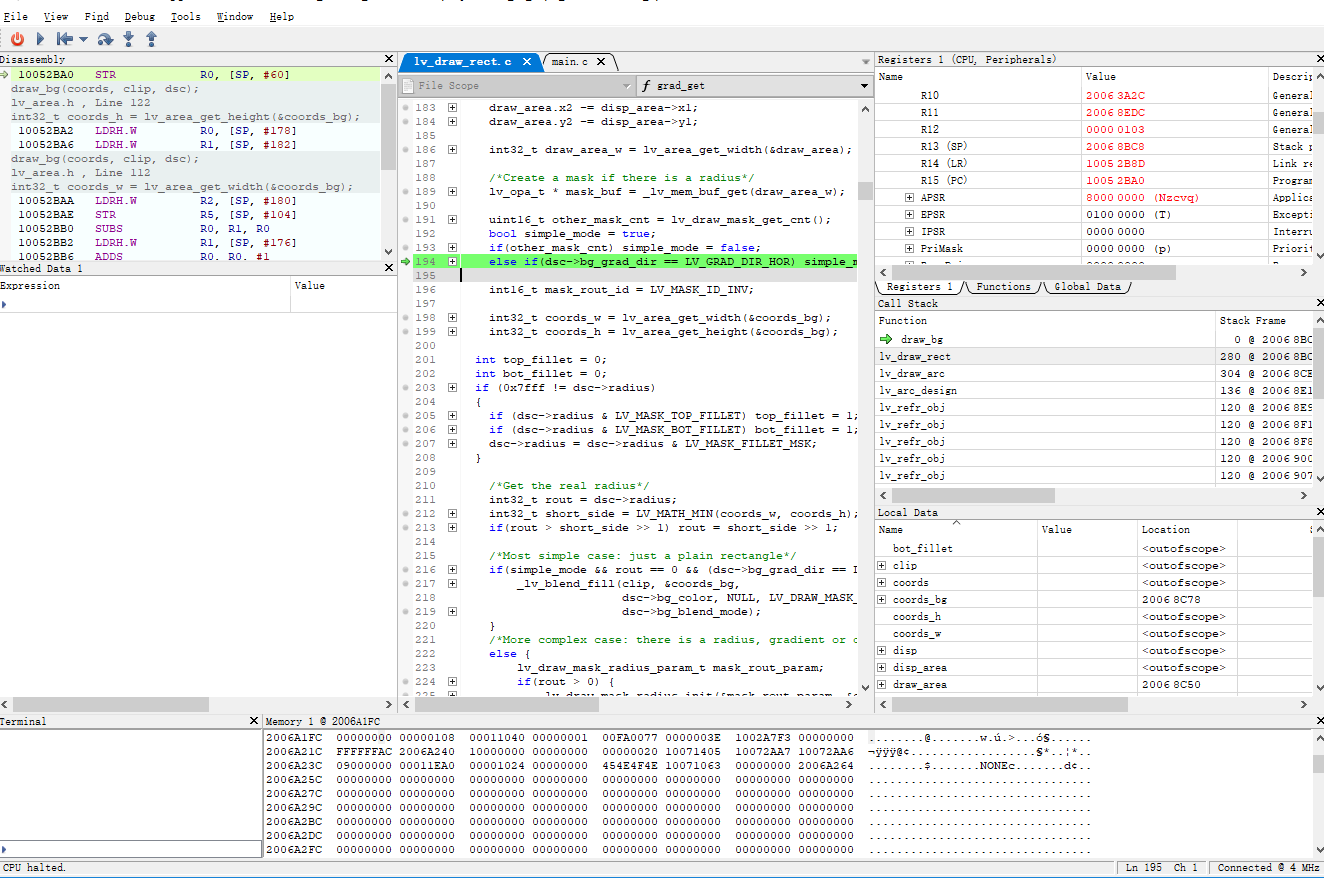 然后就可以通过菜单里面的功能,单步调试、变量查看、栈解析等操作,跟Keil类似。