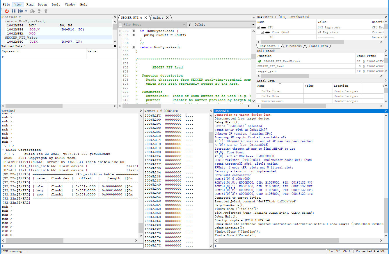 这样CPU启动,就会停留在第一条指令,当Jlink连接成功后,可以改变PC寄存器 (+2), 设置所需断点,从而调试初始化过程。