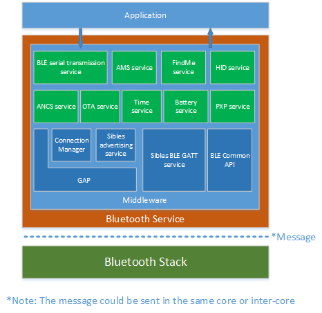 Silfi蓝牙分为两部分,一是Bluetooth LE(BLE)服务,为用户开发提供标准的Bluetooth LE API和增强服务; 另一个是经过全面测试的 BLE 5.2 协议栈,带有主机和控制器部分。 BLE 服务在 HCPU 或 LCPU 上运行。 它提供标准的通用访问配置文件 (GAP) API。 它还提供系列sibles BLE服务,帮助用户轻松开发GATT服务、客户端和GAP。 此外,蓝牙 LE 服务提供多项基于 GATT 的服务。 BLE 协议栈运行在蓝牙栈核心(LCPU)上,HCPU可以通过硬件邮箱等核心间通信机制与 BLE 服务进行通信。