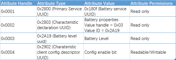 以下是电池服务的示例。 电池服务是通知客户电池更换。 因此,该服务具有具有可读性和通知属性的电池电量特性。 客户端可以编写客户端特征配置描述符(CCCD)以启用通知。 然后电池服务将通知电池电量。
