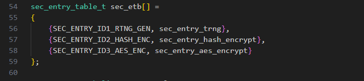 安全代码的添加可以参考 $SDK_ROOT\security\sf52x\hcpu\sec_entry.c 中的55到57行,第一步根据安全代码接口的功能为每个接口定义SEC_ENTRY_IDX_XX,id号是枚举类型,
