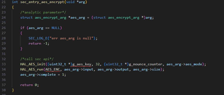 第二步编写安全入口函数,如int sec_entry_xxx(void *arg),此函数里解析传递过来的参数,调用对应的安全代码接口。