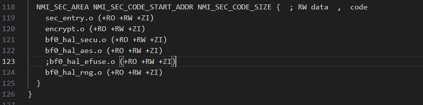 第三步,修改链接文件,将添加的安全代码链接到安全保护区域。连接文件在目录_$SDK_ROOT\example\security\hcpu\project\eh-lb525\linker_scripts_ 中,打开 link_flash.sct ,
