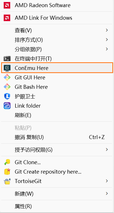 安装完成后,在任意目录点击鼠标右键打开快捷菜单,将看到如图新增的ConEmu Here菜单