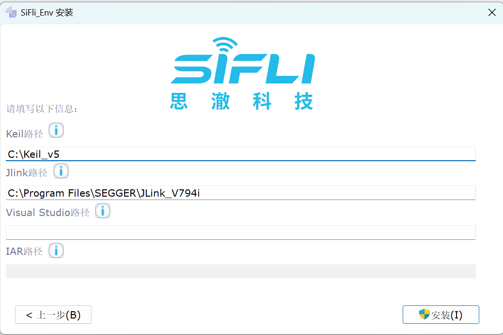 点击链接SiFli Env,下载最新版本的SiFli Env安装包,下载完成后双击运行安装程序,按提示完成安装,下图中的路径填写本机已安装的Keil、JLink、Visual Studio等软件的路径,将鼠标移动到i图标上可以查看提示,如果未安装相应软件,可以不填写。