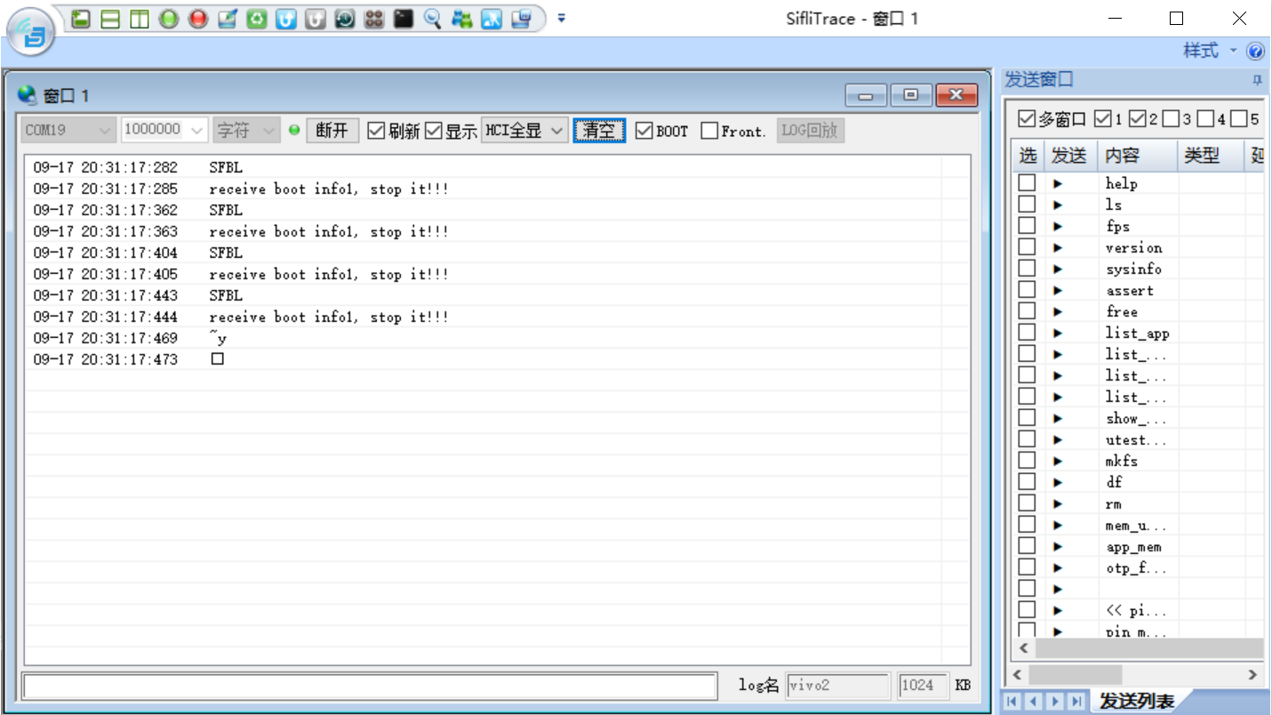 SFBL为BOOTROM启动日志,如果复位后看不见这条日志,请检查板子供电