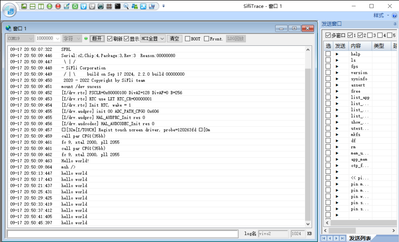 下面以SF32LB52x-DevKit-LCD开发板(板载SF32LB52x-MOD-N16R8模组)为例,介绍如何编译和下载hello_world程序到开发板中运行,并使用SiFliTrace串口调试工具查看log。