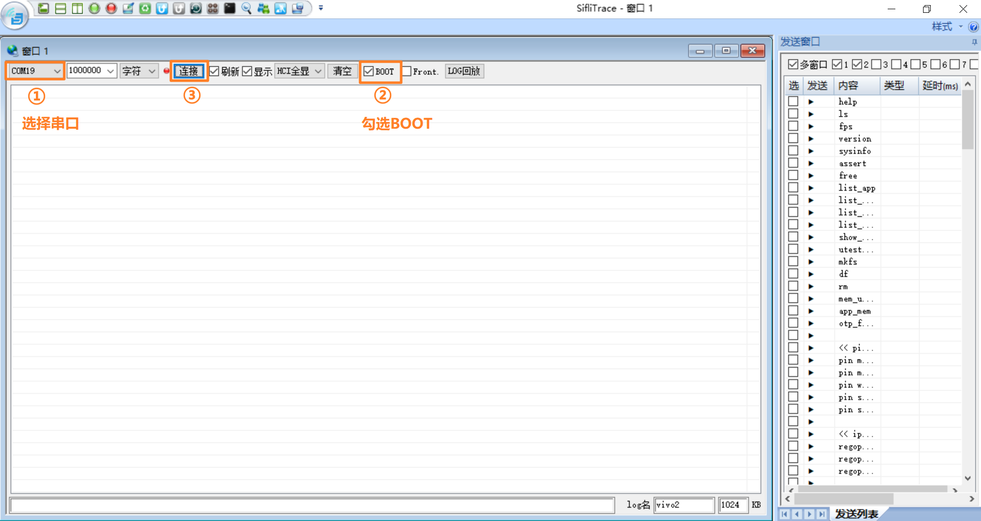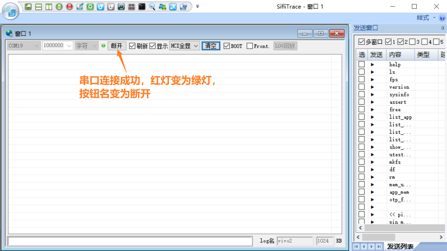 打开SiFliTrace,如下图,从下拉框选择开发板调试串口(如COM19),波特率保持默认值
