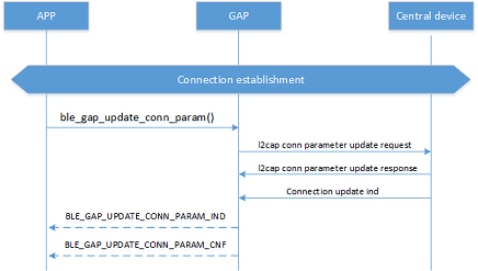 除了数据传输之外,以下子程序在 GAP 中也很重要: 1. 连接参数更新程序。 外围设备可能需要中央设备修改一些参数,例如连接间隔、监督超时,以平衡高吞吐量和低功耗。 2. 断开程序。 断开与中央设备的连接。