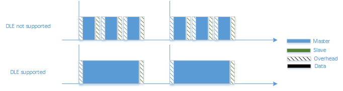 - 确保主设备和从设备都支持数据长度扩展(DLE)功能,这是蓝牙核心协议 4.2 之后的一个选项功能。 此功能允许最大数据包大小从 27 字节到 251 字节。 每个数据包都有一定的头部,当Dsize增大时,数据包的数量会减少,头部的开销也会减少。