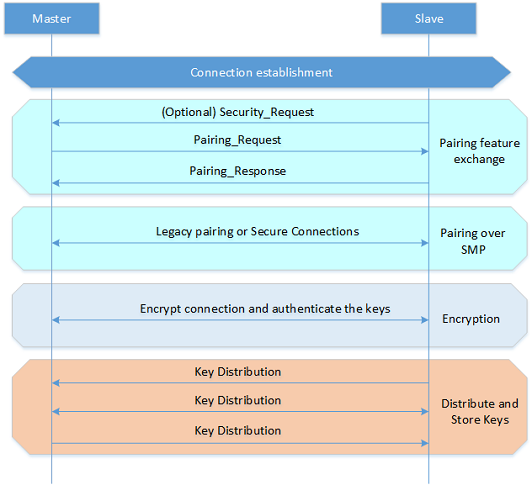 安全管理器配置文件 (SMP) 定义了生成和分发安全密钥并加密与这些密钥的链接的协议和行为。 相关 API 与 GAP 集成。 SMP 中有四个功能。 - 配对:创建共享密钥。 - 绑定:存储配对创建并用于后续连接的密钥。 绑定后,两个设备成为可信设备对。 - 身份验证:验证两台设备是否具有相同的密钥。 - 加密:加密链接以确保安全通信。