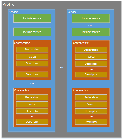 特征描述详细数据格式和行为。 它包含特征声明、特征值和特征描述符。