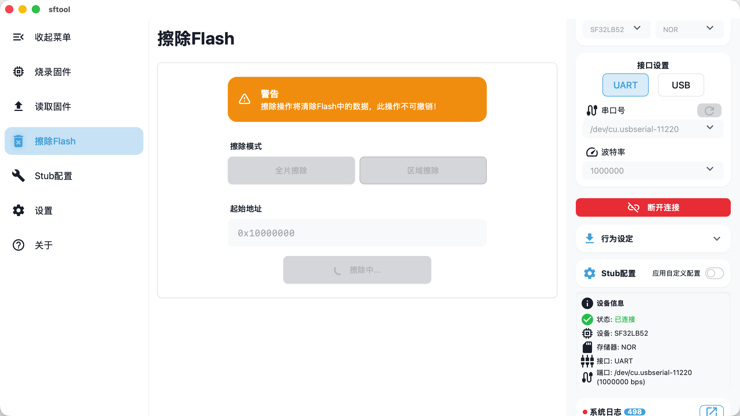 擦除操作将清除 Flash 中的数据,此操作不可撤销!