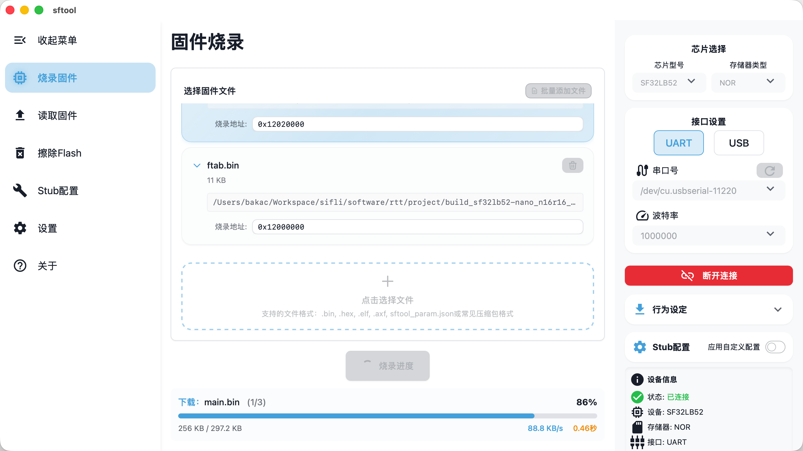 sftool_param.json配置文件说明:系统将根据 JSON 配置自动填入 Bootloader、Ftab、Main 等二进制文件及其对应地址。