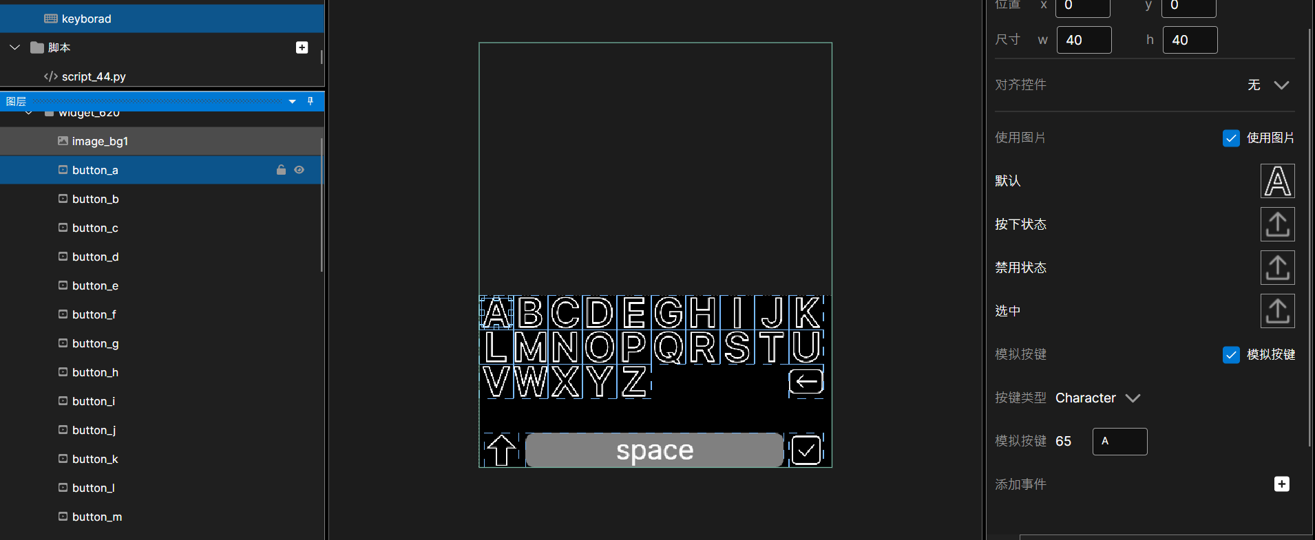 键盘¶ 1. 概述¶ 键盘控件用于配置虚拟键盘。用户需要单独创建一个键盘页面,可以在其中创建多个widget控件,然后在widget中创建多个button控件,并且将其设置为模拟按键。每一个widget都是一个键盘样式。最后生成符合要求的键盘资源文件,供固件解析并使用。 创建路径:页面>键盘 2. 演示视频¶