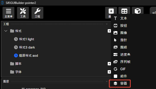 容器控件用于创建可以动态切换显示不同组件的容器。用户可以设置容器的各种属性,如位置、尺寸、对齐方式、当前显示的组件等,并生成符合要求的容器资源文件,供固件解析并使用。