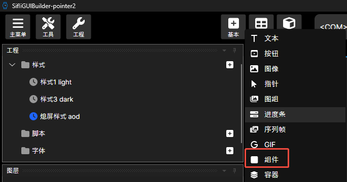 组件控件用于创建可包含其他控件的组件。用户可以设置组件的各种属性,如位置、尺寸、对齐方式、自动布局等,并生成符合要求的组件资源文件,供固件解析并使用。