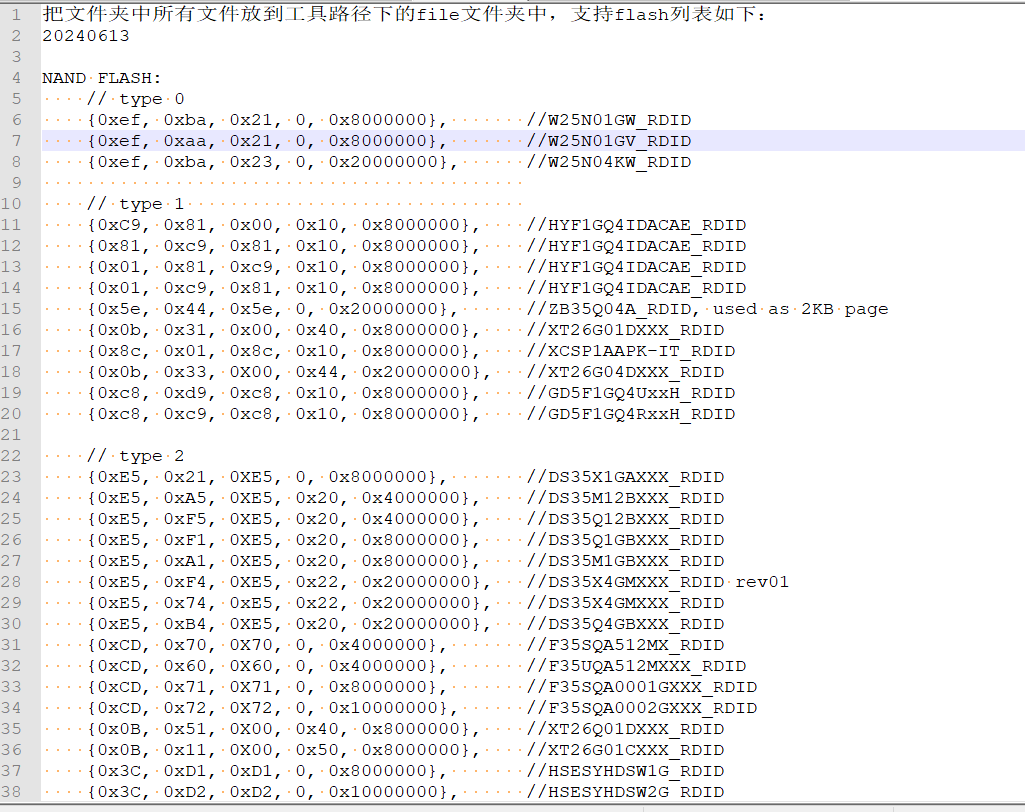 上文提到的量产工具,Impeller_3.XX.COMMON\file\readme.txt,里面有一份当前工具版本支持的flash列表