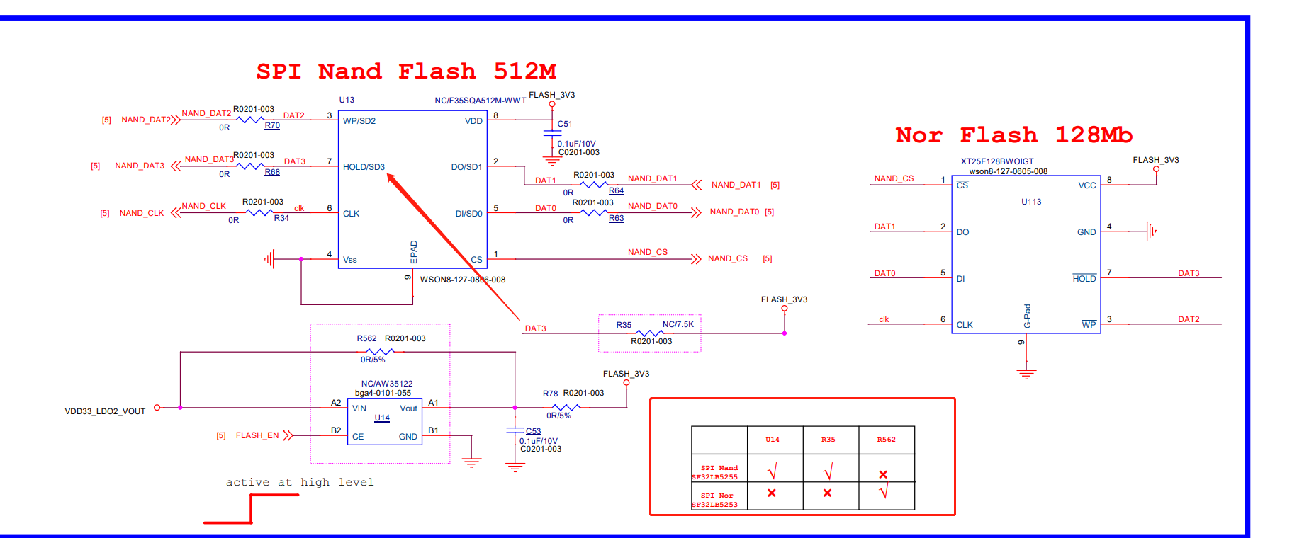 注意NAND跟NOR的硬件区别,NAND需要把HOLD上拉到FLASH_VCC. NOR不需要。