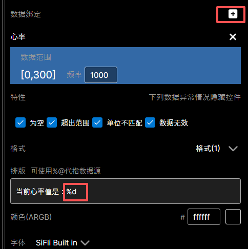 在想要使用文本控件显示数据源的数值或者数据源的字符串的时候,需要在文本控件的属性中绑定数据源,并且需要输入框中将占位符放在数据要显示的位置。